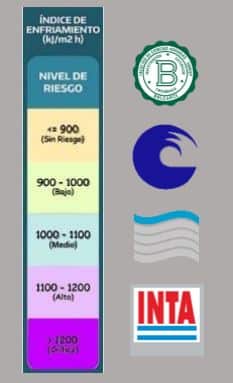 velocidad del viento, la temperatura ambiente y las precipitaciones previstas. Valores del índice superiores a 1000 kj/m2.h determinan riesgos de enfriamiento.