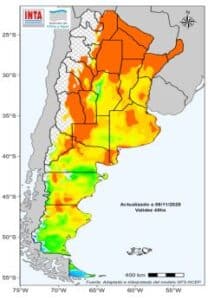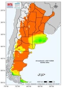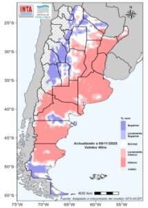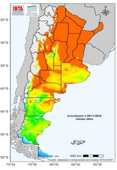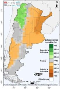 Para el próximo trimestre se prevé una mayor probabilidad de lluvias entre normales a deficitarias en las provincias del centro y norte del país y en el oeste de Patagonia. Las probabilidades de un trimestre más seco son mayores en el Litoral (color ocre).