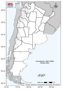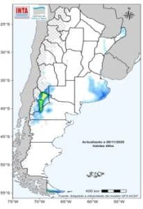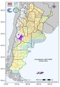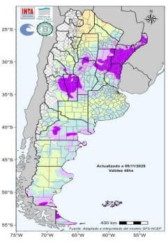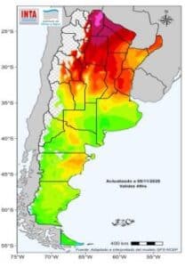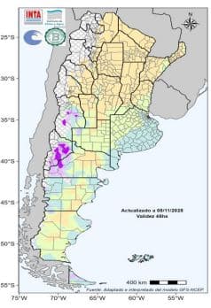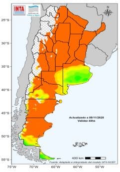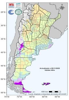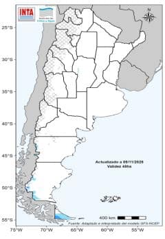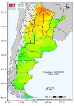 Probabilidad de heladas agrometeorológicas aisladas (menores a 3 °C) sobre el sudeste de Bs. As. durante el jueves 6. Luego, paulatino ascenso de las temperaturas con valores superiores a los 38 °C en el extremo norte hacia el martes 11.