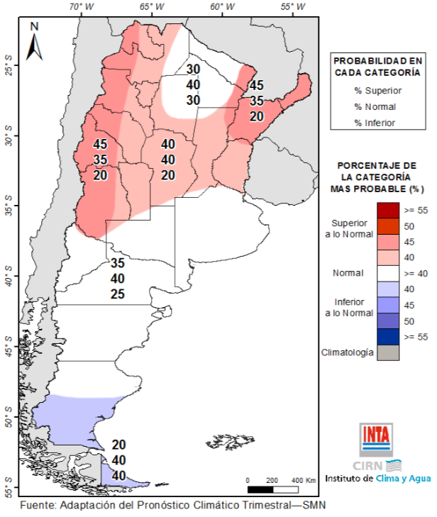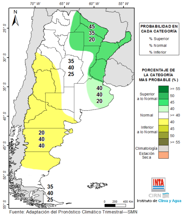 La última previsión trimestral del Foro Interinstitucional, que se reúne en el Servicio Meteorológico Nacional (SMN), indica: un trimestre con probabilidad de lluvias superiores a lo normal sobre las provincias de las regiones del NEA y Chaqueña y Buenos Aires (este), distinguiendo entre ellas, una mayor chance de un trimestre más húmedo sobre las provincias del NEA y Chaqueña. Sobre el resto del territorio nacional se prevé mayor probabilidad dentro del rango normal, exceptuando Cuyo y Patagonia (centro y norte) (Fig. 05).