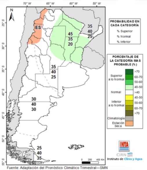 La última previsión trimestral del Foro Interinstitucional reunido en el Servicio Meteorológico Nacional (SMN) indica mayor probabilidad de ocurrencia de precipitaciones superiores a las normales sobre las provincias de la región Chaqueña, NEA (centro y sur) y Córdoba (noreste). Mayores chances de ocurrencia de precipitaciones trimestrales entre normales a superiores a las normales sobre el NEA (norte), NOA (este), San Luis y región Pam- peana (centro y este). Chances de lluvias normales para el trimestre se prevén para Cuyo (centro y sur), La Pampa (oeste) y Patagonia (centro y norte). Probabilidad de ocurrencia de lluvias entre normales a inferiores a las normales se esperan para Patagonia (sur). Las provincias de San Juan (norte) y NOA (oeste) transitan su estación seca durante este periodo y no se realiza previsión de tendencia (Fig. 05).
