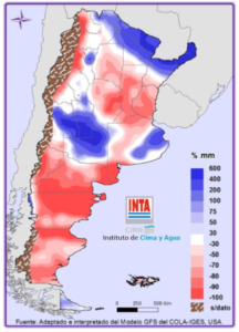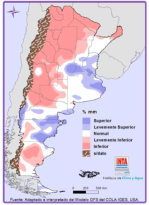 - En las zonas mencionadas y en áreas de Cuyo (sur), Tierra del Fuego y Tucumán, las precipitaciones pronostica- das serían superiores a las normales para el período, mientras que en el resto del territorio resultarían entre escasas a nulas (Fig. 02).