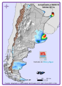 Lluvias pronosticadas menos intensas que la semana que la precede, se observarían entre el 14 y el 21 de Mayo. Las principales, ocurrirían sobre el Litoral, región Pampeana (este) y Patagonia.