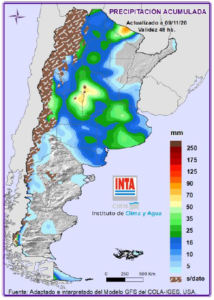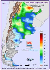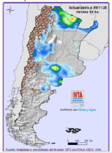 Precipitaciones: Lluvias significativas sobre el norte los días Martes y Domingo y sobre región Pampeana (sur y oeste) el Viernes y el Sábado. Temperaturas: Avanzaría un frente frio sobre el centro del país el día Jueves. De todos modos, esta información debe chequearse diariamente para la mejor toma de decisiones (http://siga.inta.gob.ar/#/forecast).