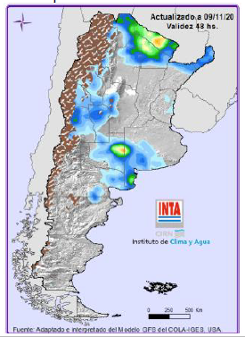El Martes 10, se prevé un sistema de mal tiempo que afecte el norte del país con lluvias y tormentas de variada intensidad, especialmente sobre Formosa y Chaco; también se registrarían lluvias y tormentas aisladas sobre Cuyo, La Pampa, Bs. As. (sudoeste) y Río Negro (este). El Miércoles 11, se prevé algunas lluvias y chaparrones aislados sobre Bs. As. (centro y sur), Cu-yo (norte) y áreas del NOA. A partir del Jueves 05, un frente frío comenzaría a afectar el centro del país con algunas lluvias y tormentas aisladas sobre La Pampa, Mendoza y San Luis. Se registrarían algunas lluvias y chaparrones aislados sobre NOA (oeste).