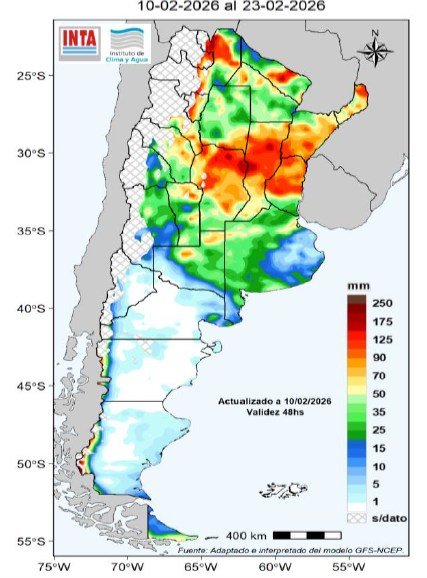 Para las próximas dos semanas se prevén lluvias de variada intensidad, con acumulados más significativos sobre el norte y el centro-este del país, mientras que, en laregión Pampeana sur y la Patagonia los acumulados serian menos significativos.