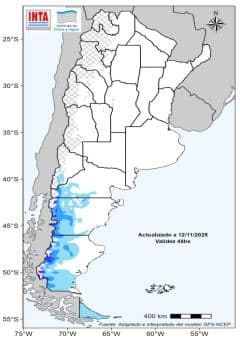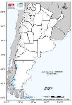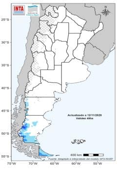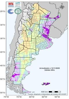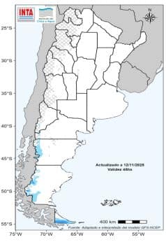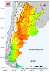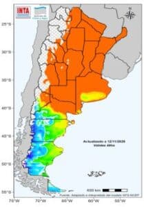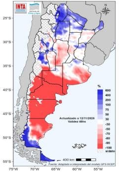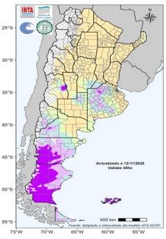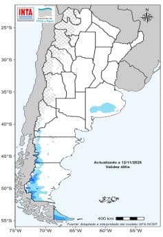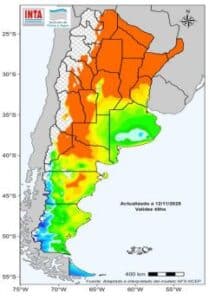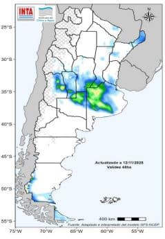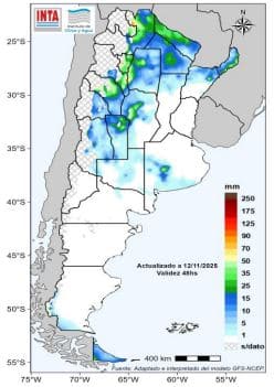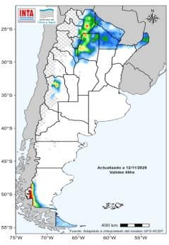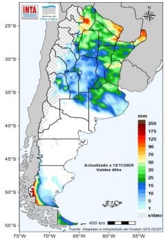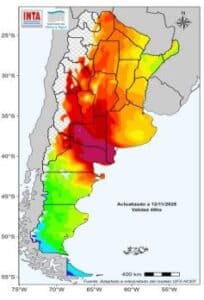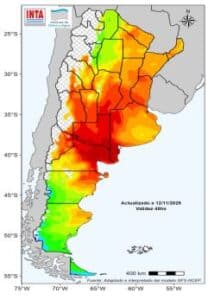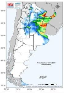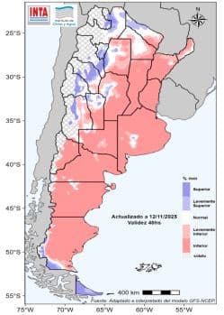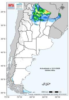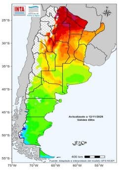 Para los próximos 14 días se prevé precipitaciones de variada intensidad sobre gran parte del centro y norte del país. Los mayores acumulados se registrarían en las provincias del NOA y NEA. En la zona núcleo, para la semana del 19 al 24, el pronóstico no indica precipitaciones significativas.