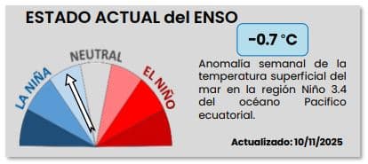 El fenómeno se mantiene bajo condiciones de La Niña, con probabilidad de persistir hasta mediados del verano y un posible retorno a condiciones neutrales hacia el final del verano o el comienzo del otoño.
