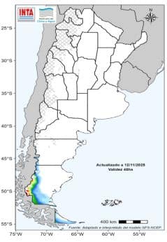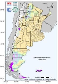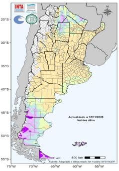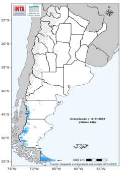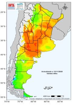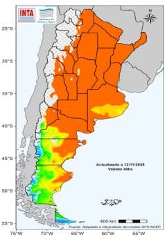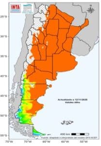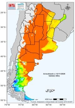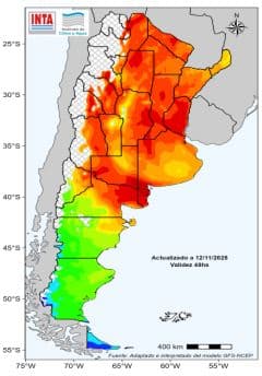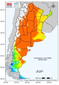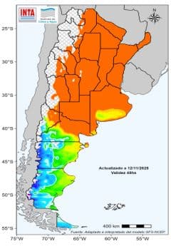 Paulatino ascenso de las temperaturas con valores superiores a los 38 °C en el norte y centro-oeste del país. Baja probabilidad de heladas agrometeorológicas (menores a 3 °C) sobre el sudeste de Bs. As. durante el lunes 17.