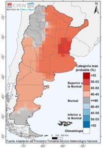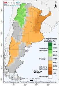 Para el próximo trimestre se prevé una mayor probabilidad de lluvias entre normales a deficitarias en las provincias del centro y norte del país y en el oeste de Patagonia. Las probabilidades de un trimestre más seco son mayores en el Litoral (color ocre).