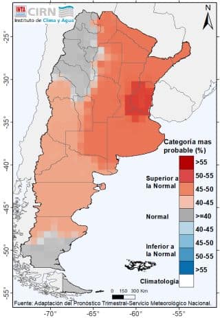 Se prevén valores superiores a lo habitual para el periodo en gran parte del territorio nacional (colores rojos). Las probabilidades de ocurrencia de un trimestre más cálido son mayores al 45- 50% en las provincias del centro y norte del país (color rojo oscuro).
