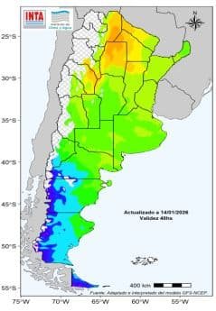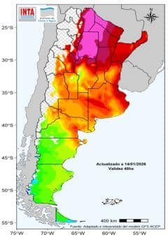 Ambiente cálido a caluroso sobre la mayor parte del centro y norte argentino. A partir del domingo 18, habría temperaturas elevadas en la Patagonia. Se registrarían valores que podrían superar los 36–38 °C. Las temperaturas mínimas se mantendrán con valores superiores a 18– 22 °C en el centro y norte del territorio