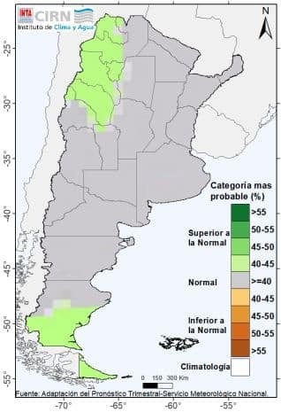 Para el próximo trimestre se prevén lluvias en el rango normal para la época sobre gran parte del territorio. Las probabilidades de transitar un trimestre entre normal a más húmedo son mayores en las provincias del noroeste y sur del país (color verde).