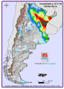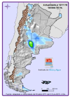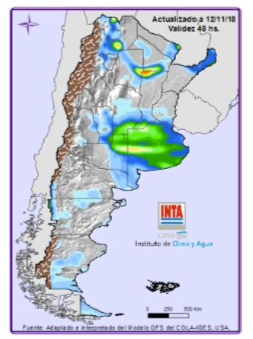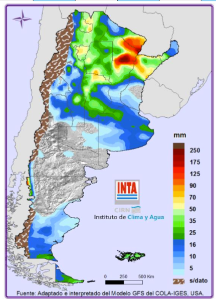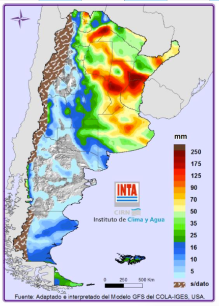 Nuevamente eventos destacados para la época sobre el NOA, con lluvias sobre Salta (este) que podrían superar los 90 mm. Sobre Santiago del Estero (noreste y sur), Córdoba (este), Santa Fe (centro y noreste), Entre Ríos (norte) y Corrientes (sur y noreste), Misiones y Buenos Aires (centro y norte) los valores de precipitación estarían entre los 70 mm y 150 mm, pudiendo en algunas casos puntuales superar dicho valor (Fig. 01).