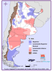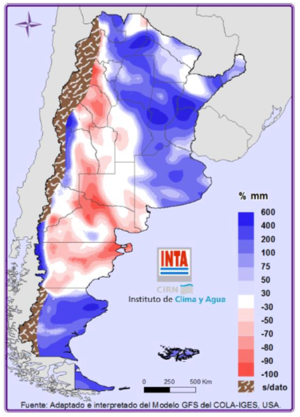 A excepción de Patagonia (centro y norte), región Pampeana (oeste) y región de Cuyo, en el resto del territorio los valores de precipitación serían superiores a los normales para la época (Fig. 02).