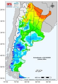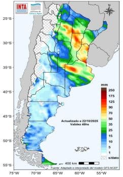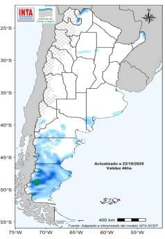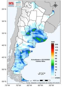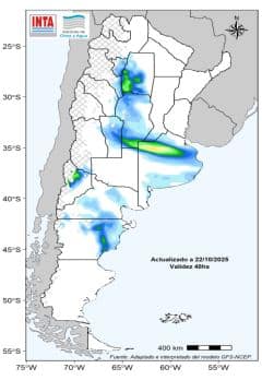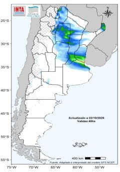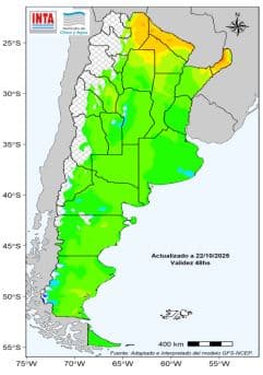 El pronóstico para las próximas dos semanas indica la posibilidad de importantes acumulados de precipitación, especialmente sobre el este del territorio. En la región Pampeana, los altos niveles de humedad en el suelo y la persistencia de lluvias podrían seguir dificultando el avance de las labores de siembra de los cultivos de verano.