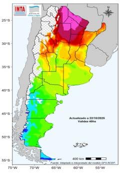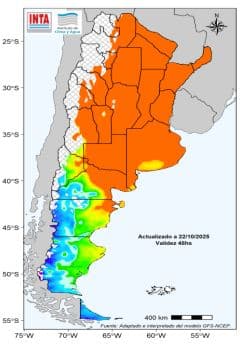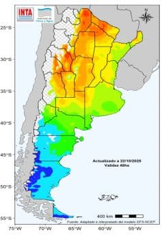 Temperaturas con valores superiores a los 38 °C en el extremo norte del país hasta el sábado 25. Posterior marcado descenso de las temperaturas. Probabilidad de heladas agrometeorológicas aisladas sobre el sur cuyano y pampeano (menores a 3 °C). Heladas moderadas a intensas en la Patagonia (menores a -3 °C).