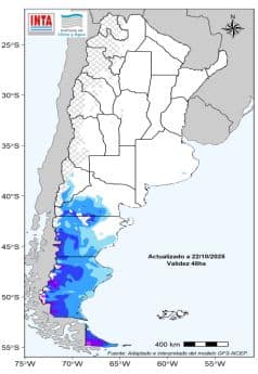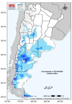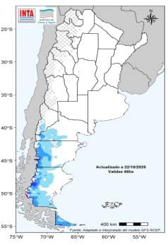 Para los próximos 14 días se prevé acumulados de variada intensidad sobre gran parte del centro y norte del territorio. En algunos casos podrían estar acompañados de tormentas localmente intensas; en particular la primera semana. Habría lluvias y nevadas aisladas en la Patagonia, incluyendo Mendoza.