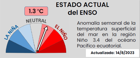 Este fenómeno se encuentra transitando hacia la fase El Niño dado, en particular, por la persistencia de la temperatura del océano Pacífico Ecuatorial en umbrales cálidos.