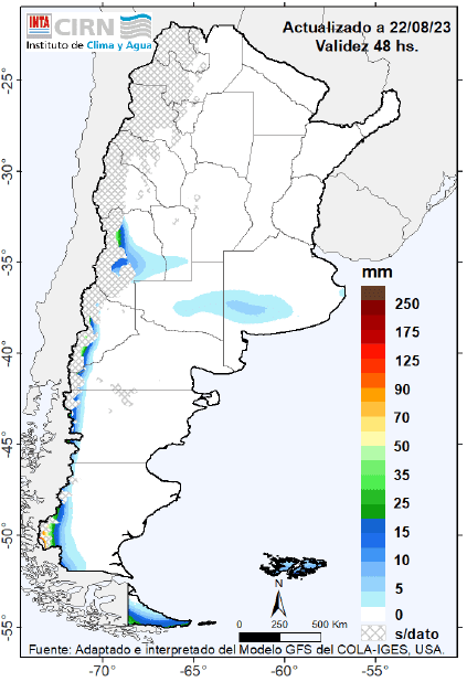 En la Patagonia se registraría un pulso de aire polar con vientos del sector sudoeste, nubosidad en disminución y marcado descenso de las temperaturas. Hay probabilidad de algunas lluvias y nevadas aisladas sobre. Tierra del Fuego y zonas cordilleranas de Mendoza y Neuquén. Se registrarían heladas intensas.