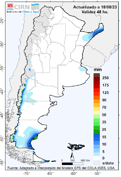 Lluvias y tormentas de variada intensidad sobre La Pampa y Bs. As. (centro y sur) Lluvias y nevadas de variada intensidad sobre la Patagonia especialmente sobre zonas cordilleranas (incluyendo Mendoza).
