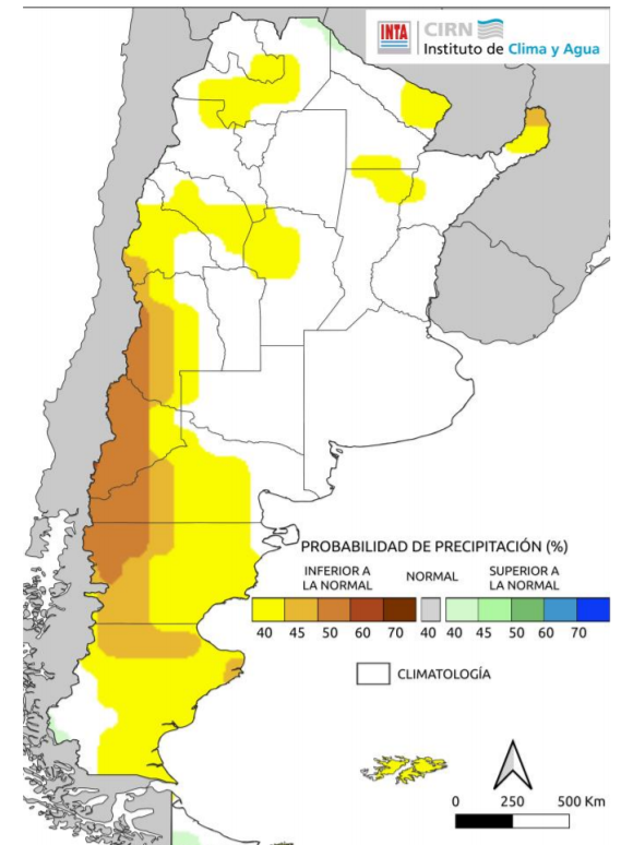 La última previsión trimestral del International Research Institute (IRI) estima, con un 40-50% de probabilidad, la ocurrencia de precipitaciones inferiores a las normales en áreas de las regiones del NOA (centro), NEA (oeste y noreste), Cuyo (oeste), Pampeana (noroeste) y la mayor parte de Patagonia. En el resto del territorio nacional el pronóstico muestra una equidad en las posibilidades de ocurrencia de los tres eventos (inferior o superior a lo normal o normal) y al no haber herramientas suficientes para categorizarla corresponde a “Climatología” (Fig. 05).