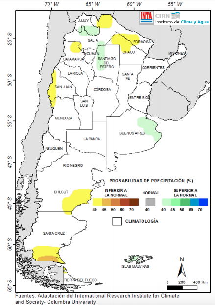 La última previsión trimestral del International Research Institute (IRI) estima con un 40-45% de probabilidad de ocurrencia, precipitaciones superiores a las normales en Buenos Aires (noreste) y áreas de Jujuy (sur) y Santiago del Estero (oeste). La probabilidad de ocurrencia de un trimestre más seco sobre áreas del norte argentino, San Juan, Chubut (este) y Santa Cruz (sur) oscila entre valores de 40 a 45%. En el resto del territorio nacional se observan áreas donde el pronóstico muestra una equidad en las posibilidades de los tres eventos (inferior o superior a lo normal o normal) y, al no haber herramientas suficientes para categorizarla, corresponde a “Climatología” (Fig. 05).