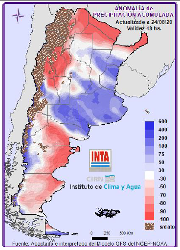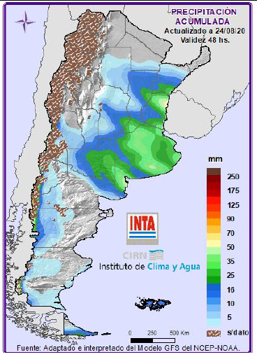 Para el período de referencia, la mayor parte del territorio no presentaría eventos significativos de lluvia, prevaleciendo una situación de lluvias por debajo de lo normal para la época. Las lluvias de bajas cantidades acumuladas se concentrarían sobre el este del país y área cordilleranas de Cuyo y Patagonia (Fig. 03 y 04).