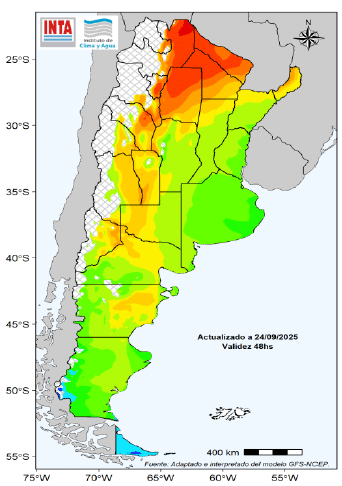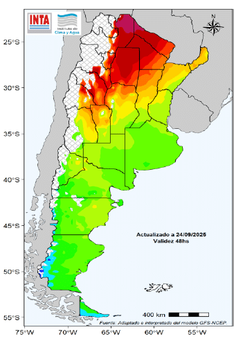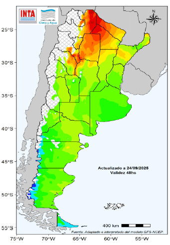 Para el jueves 25 habría heladas agronómicas (menores a 3°C) en prov. de Bs.As. Luego, paulatino ascenso de las temperaturas; se podrían alcanzar los 38°C en el extremo norte del país. Heladas débiles a moderadas (menoresa-3°C) en la Patagonia.