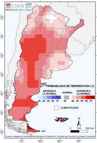 Se prevén valores superiores a lo habitual en gran parte del territorio nacional. Las probabilidades de ocurrencia de un trimestre más cálido son mayores al 50% en las provincias del centro-oeste y sur del país.