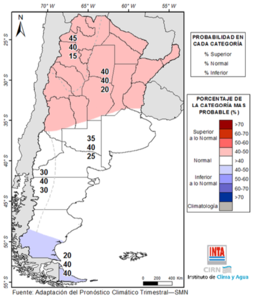 La última previsión trimestral del Foro Interinstitucional reunido en el Servicio Meteorológico Nacional (SMN) indica mayor probabilidad de ocurrencia de precipitaciones superiores a las normales, con un 50% de probabilidad, sobre Entre Ríos, Corrientes (sur) y Santa Fe (centro-este). Mayores chances de ocurrencia de precipitaciones trimestrales con precipitaciones superiores a las normales en el Litoral, Chaqueña (norte), Salta (este) y Buenos Aires (norte y este). Se prevé mayor probabilidad de presentarse un trimestre con lluvias normales sobre las provincias de las regiones Pampeana (oeste), Cuyo, NOA y Patagonia (Fig. 05).