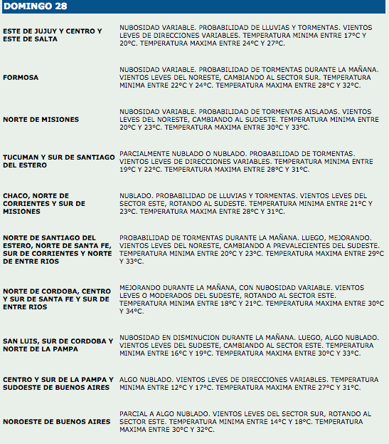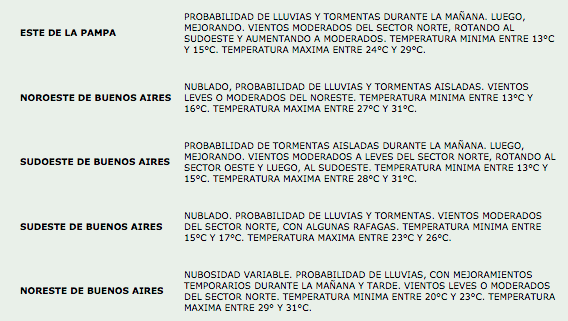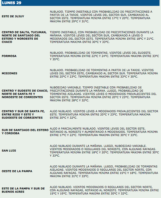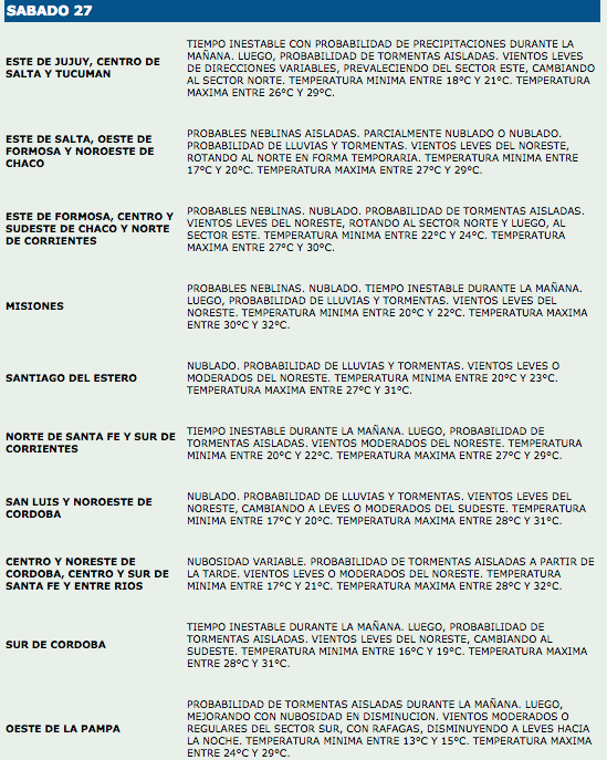 ClimaPronóstico meteorológico 27 de enero de 2018FacebookTwitterWhatsAppTelegramEmailImpresión Pronóstico meteorológico para las actividades agropecuariasFuente: SMN