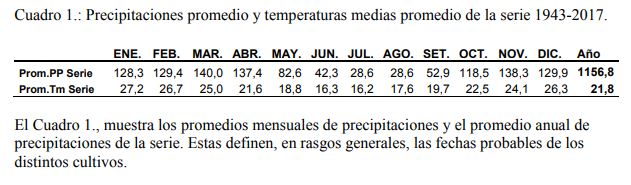 El Cuadro 2., muestra las diferencias mensuales de las precipitaciones respecto de la serie 1943- 2017. El Cuadro 1., por otro lado, indica un promedio de disponibilidad de agua. Este, sirve como un parámetro a tener en cuenta y evaluar cómo se vienen presentando las condiciones climáticas del año, para realizar las actividades. Las condiciones climáticas niño o niña también afectan esta distribución, en series cortas de años. Las características que se presentan los años (el actual) nos permiten definir el manejo del cultivo, para ubicar las etapas críticas en ambientes más favorables.