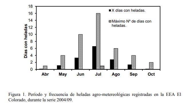 La Figura 1, muestra el período y la frecuencia máxima y mínima de ocurrencia de heladas registradas durante la seria 2004/09 en la EEA El Colorado del INTA. El período libre de heladas agro-metereológicas se extendió desde el 29 de octubre al 5 de mayo, correspondiendo 159 días libres de temperaturas mínimas registradas a la intemperie, a 0,05 m de altura de la superficie del suelo con temperaturas iguales o inferiores a 0,0 ºC. Y, el período libre de heladas metereológicas correspondió desde el 09 de septiembre al 16 de mayo, alcanzando 250 días libres de temperaturas mínimas registradas bajo abrigo metereológico a 1,5 m de altura sobre el nivel del suelo.
