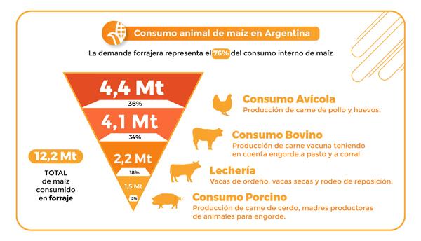 Respecto al consumo de maíz por parte del ganado bovino, se consolida como el segundo sector con mayor participación en la demanda del cereal en Argentina. Es importante recalcar que en este caso, el sistema de engorde implementado produce variaciones en las dietas y donde la modalidad a corral o feedlot es la más intensiva en el consumo del cereal, a diferencia de lo que ocurre con la cría a campo. En este sentido, a lo largo de las últimas décadas, el aporte de la modalidad a corral en lo que respecta a la faena nacional se ha incrementado sustancialmente, generando una mayor demanda de maíz principalmente en las últimas etapas de engorde del animal.
