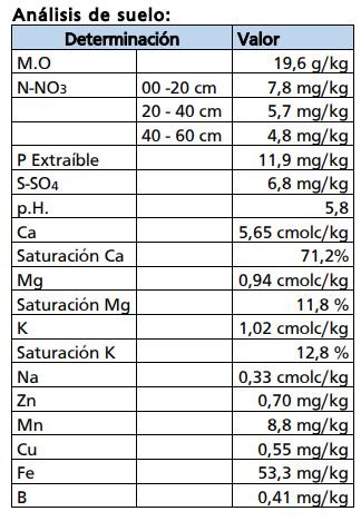En la campaña 2017/18 se realizaron dos épocas de siembra, una temprana: 25 de setiembre y una tardía: el 13 de noviembre. Ambas experiencias se realizaron en el mismo lote, trabajado por los Hnos Massaccesi, próximo a la localidad El Provincial, partido de 9 de Julio. El antecesor fue soja de primera. Previo a la siembra se realizó un muestreo de suelo, Cuadro 1, el mismo sirvió de base para ajustar la fertilización, la cual se realizó con la misma cantidad de kilogramos y productos para ambas fechas de siembra.