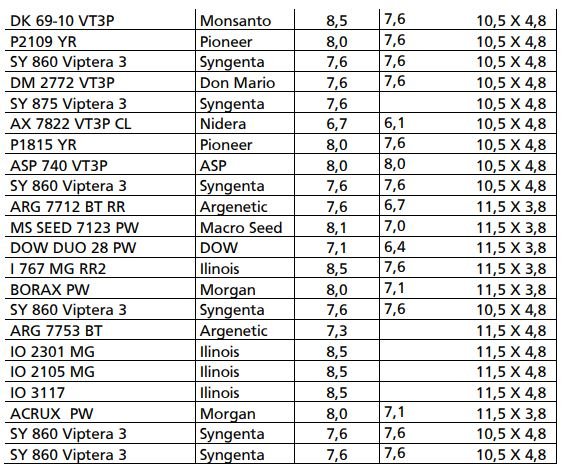 Herbicida preemergente: 2,5 kg/ha de Atrazina 90 % + 1 l/ha de Acetoclor + 1,5 l/ha de Glifosato 68 % + 20 cc/ha Karate Zeon + 70 l/ha de agua. A efectos de poder ubicar el disco perforado adecuado para cada semilla, todos los híbridos fueron pasados por un banco de prueba, trabajándose en el mismo hasta encontrar el disco lo más adecuado posible. En cuanto a la densidad de siembra, este año se consultó a cada semillero con que densidad querían sembrar los materiales con que cada uno participaba. En el Cuadro 2 se presentan el nombre del híbrido, el criadero al cual pertenece, el disco perforado utilizado para cada híbrido y la densidad de siembra real de cada material, tanto para siembra temprana como demorada.
