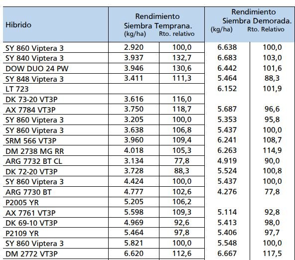 *: Siembra temprana; ** Siembra demorada. Los espacios vacíos en la densidad de siembra, significa que no fue sembrado en esa fecha de siembra. La cosecha se realizó en forma mecánica. Para cada parcela se recolectaron 4 surcos por 80 m de largo. A continuación se detallan los rendimientos a humedad recibo y el rendimiento relati vo de cada hibrido participante. Cuadro 3.