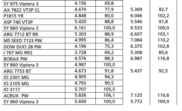 Diseño: Parcelas con testigos apareados cada 5 híbridos. La comparación de rendimiento de cada híbrido se realizó con respecto a los dos testigos más cercanos, participando cada uno de ellos en forma proporcional a la distancia al híbrido a evaluar. El rendimiento se expresó en forma relativa al testigo. Como material testigo se utilizó el híbrido SY 860 Viptera 3. Al testigo siempre se le asignó un valor 100.