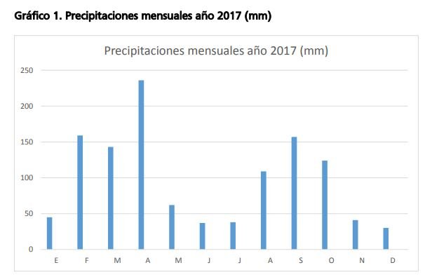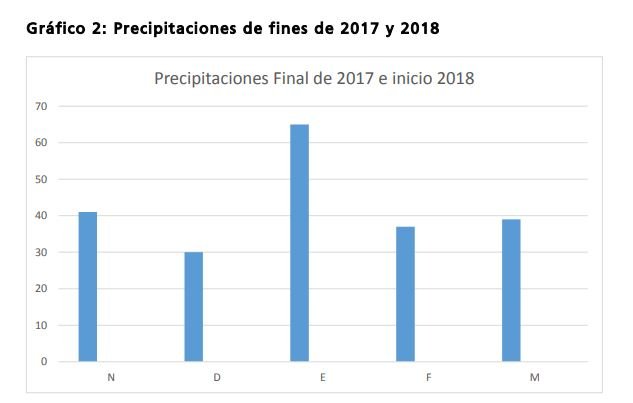 La campaña 2017/18 fue una campaña muy atípica desde el punto de vista ambiental. Durante el año 2017, se concentraron importantes precipitaciones durante el otoño e inicio de la primavera, posteriormente los dos últimos meses del año fueron muy secos. Gráfico 1. El volumen total precipitado durante todo el año 2017 fue de 1.181 mm. Las precipitaciones de febrero, marzo y abril (2017), fueron elevadas, ocasionando inundaciones en diferentes partes del partido. Un nuevo flujo hídrico se dio a inicios de la primavera, posteriormente comenzó la merma en las precipitaciones. Las siembras de maíz realizadas entre setiembre y octubre, se efectuaron sin mayores inconvenientes. A partir de noviembre cambió totalmente el panorama y se pasó, prácticamente sin escala, de muy buena humedad a un déficit hídrico importante. Gráfico 2.