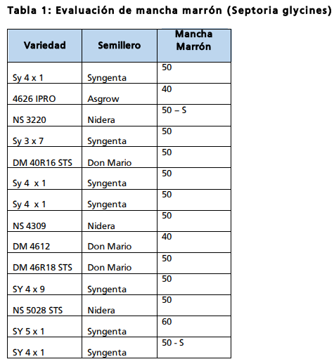 Anualmente la prueba de variedades de soja permite conocer el comportamiento de los materiales que se siembran en la zona y las nuevas variedades que los criaderos ponen a disposición de los productores. En la campaña 2018/19 se efectuó un ensayo empleándose un diseño de macroparcelas utilizando un testigo a fin de comparar los materiales y de esa manera poder disminuir la variabilidad edáfica que pudiese existir. Cada parcela conto de 7 surcos espaciados a 0,35 m entre sí por un largo de 150 m. Cómo material testigo se utilizó la variedad SY 4 x 1. El manejo fue similar al que puede hacer un productor, con un buen control de malezas, una fertilización que aportó fósforo y azufre y un control de enfermedades fúngicas con fungicidas. La siembra se realiz ó el 5 de noviembre. Se sembraron 350.000 semil las/ha, las cuales previamente fueron inoculadas. Durante el desarrollo del cultivo y antes de aplicar fungicida los materiales participantes fueron evaluados respecto a la principal enfermedad prevalente: mancha marrón (Septoria glycines). Tabla 1