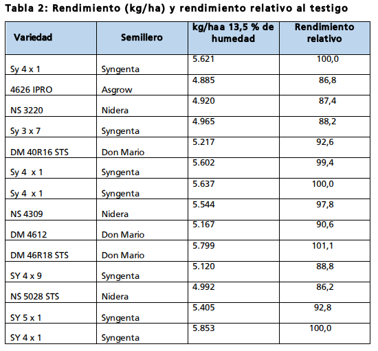 En la campaña 2018/19 se efectuó un ensayo empleándose un diseño de macroparcelas utilizando un testigo a fin de comparar los materiales y de esa manera poder disminuir la variabilidad edáfica que pudiese existir. Cada parcela conto de 7 surcos espaciados a 0,35 m entre sí por un largo de 150 m. Cómo material testigo se utilizó la variedad SY 4 x 1. El manejo fue similar al que puede hacer un productor y los resultados se presentan a continuación.