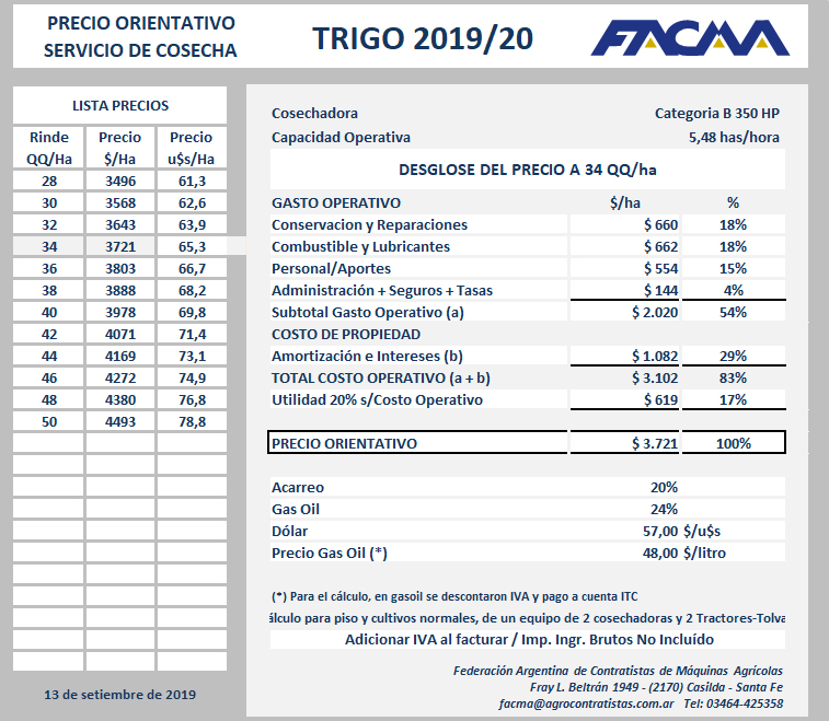 La Federación Argentina de Contratistas de Maquinaria Agrícola (FACMA), publicó por primera vez precios orientativos en dólares para el servicio de cosecha de trigo 2019/20.