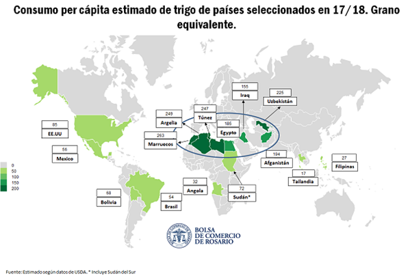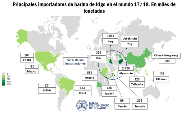 Lo interesante del mercado internacional de la harina de trigo, es que el 52 % de las importaciones de este producto se concentran en un área geográfica reducida, de la que Argentina se encuentra muy lejos. En esta zona, los principales países importadores son Afganistán, Iraq, Uzbekistán, Sudán, Siria, Yemén y Somalía. Todos estos países tienen características similares: no tienen una producción sustancial de trigo y, además, no poseen una industria moliera que permita al país importar granos y abastecer internamente a la población de harina de trigo. En la mayoría de los casos, las guerras civiles y conflictos bélicos que han tenido estos países, han destruido la industria molinera local y por diferentes razones no han podido recuperarse. También sobre esta región se observa un alto consumo per cápita de trigo. En los países del mundo árabe el consumo de trigo (en grano equivalente) por habitante puede sobrepasar los 200 kg por año, debido a la fuerte utilización del trigo en la elaboración de panes y semolinas.