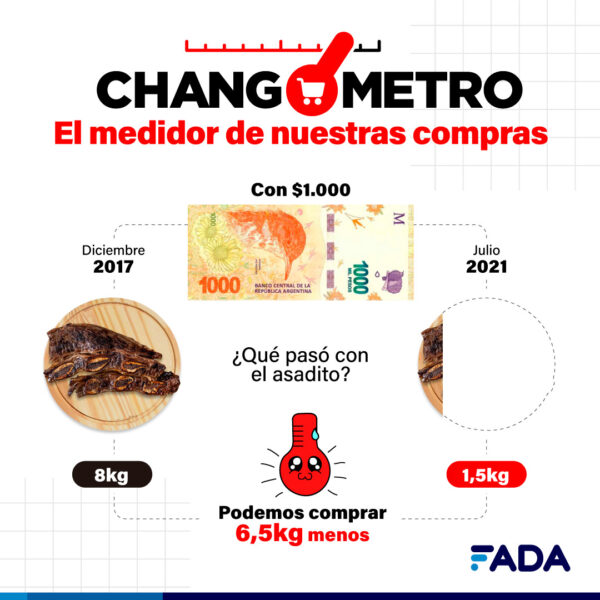 Otro dato curioso que arroja el “Changómetro” surge de aplicarlo a productos en particular. Pongámoslo en el asado. “Si nos vamos cuatro años atrás, con mil pesos veríamos a cuatro familias comiendo un asado, pero hoy con esa misma plata, no nos alcanza ni para una sola familia, destaca David Miazzo, Economista Jefe de FADA. “Esta puesta en imágenes cotidianas nos sirve para entender los datos duros: con los mil pesos del 2017, comprábamos 8 kilos de asado, y hoy apenas nos alcanza para un kilo y medio, en el medio perdimos seis kilos y medio”, detalla Miazzo.