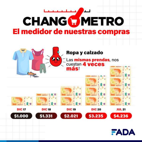 ¿Qué comprábamos con mil pesos y para qué nos alcanza hoy? Lanzan el “CHANGÓMETRO”, el Medidor de nuestras compras. Un desarrollo mensual que le mide la temperatura a la inflación. Con mil pesos ¿Qué comprábamos cuatro años atrás y para que nos alcanza hoy? “El termómetro arroja que para comprar un changuito que a fines de 2017 nos salió mil pesos, hoy tenemos que gastar más de cuatro mil ($4.401). Mismo changuito, con mismos productos, cuatro veces más”, afirma Natalia Ariño, economista de FADA. “Pero atención, no sólo pasó con lo del supermercado, también con la ropa, las mismas prendas nos cuestan 4 veces más. La ropa nos comprábamos con mil pesos, ahora nos sale cuatro mil, agrega Ariño.