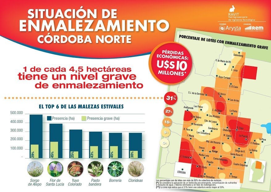 Según el relevamiento que la Red Agropecuaria de Vigilancia Tecnológica (RAVIT) viene haciendo con el apoyo de Arysta LifeScience Argentina, el 22% de las 880.000 hectáreas estudiadas en el norte de Córdoba se encuentra gravemente enmalezadas. Se considera como “grave” a aquellos lotes que presentan más del 30% de cobertura de malezas.