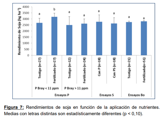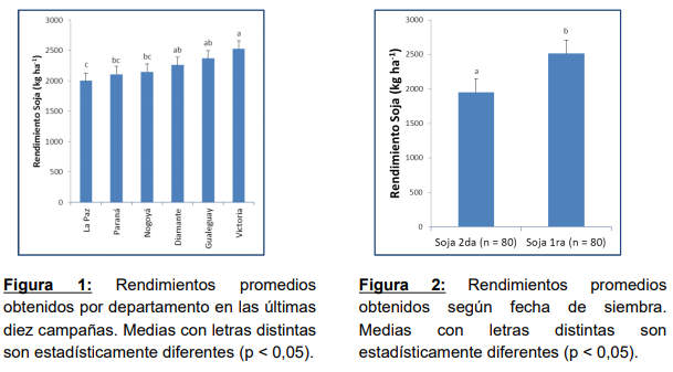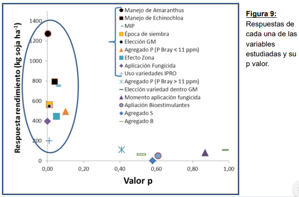 La soja es el cultivo dominante en varios países de la región, siendo una fuente de ingreso importante para productores y estados. En Argentina, Entre Ríos ocupa el 4to puesto en importancia por superficie sembrada. La mayoría de los principales sistemas productivos entrerrianos presentan una brecha productiva considerable. La ponderación de la influencia de los distintos problemas permitiría enfocar esfuerzos para resolver los más relevantes. El objetivo del presente trabajo es sintetizar el impacto de las principales variables que explican el rendimiento del cultivo, tomando como indicador la respuesta junto con el nivel de significancia estadístico de cada una de las comparaciones.
