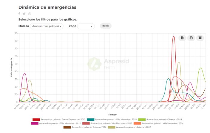Resultados obtenidos por especialistas, mostraron que la emergencia de malezas por lo general sigue un patrón característico en cada especie. Para poder caracterizarlas, numerosos investigadores del país han relevado la dinámica de emergencia de diversas especies de malezas, en distintas zonas agrícolas del país, durante años. Desde REM hace ya varios años, que esta información se sistematizó para poder visualizarla de manera conjunta y práctica, y facilitar su análisis.
