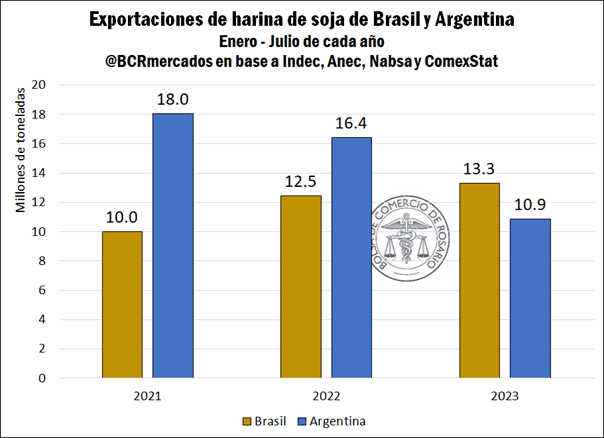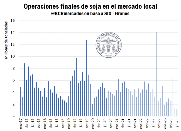 Con este marco, julio del 2023 cierra como el mes más bajo de toda la comercialización de soja de la serie histórica (comienza en enero 2017). Las compras de soja en julio pasado cayeron un 74% respecto al mismo mes del año pasado. No conforme con ello, 6 de los últimos 7 meses de este año se muestran con en la comercialización más baja de soja para cada mes del año.